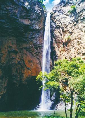 奇幽。沿谷穿行在峭崖陡壁深幽狭谷中,抬头眺望,天成一线,呈“一线天”。穿过“一线天”行至“天门瀑”前已无路,但见断崖绝壁中,百