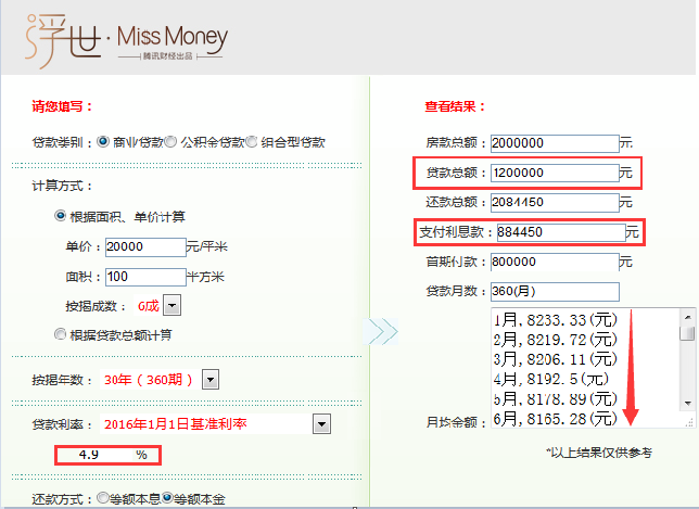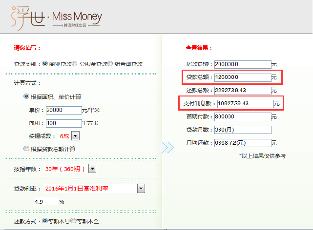 为了方便比较和说明问题,我们用具体的数字来计算。假如现在一套房子的价格是200万,现在需要贷款120万,贷款期限为30年。现在我们来算算每种贷款方式在30年到期时要还的本息各需要多少钱。我们首先来看看商业贷款的两种还款方式: