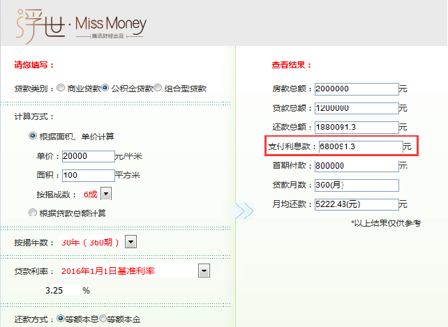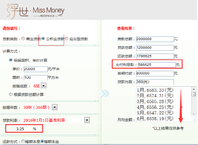 1)公积金贷款,还款方式为等额本息:如图所示这种还款方式30年下来,贷款利息为680091.3元,约为68万元;