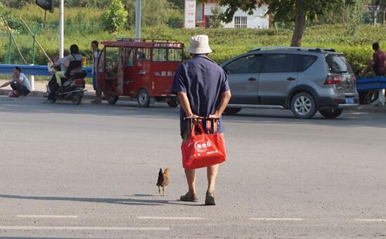 看看天色不早了,给围观者讲得兴起的李老先生赶忙收住话茬,说道:“今天我这是带着它去北边的汪庄外甥女家走亲戚的!它非一步不离的跟着!疙瘩,走!”听到叫声,小鸡乖乖的跟着李老先生向北边走去…… |